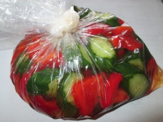 ・熱いままの鍋の中に、切ったきゅうりとパプリカを入れる。