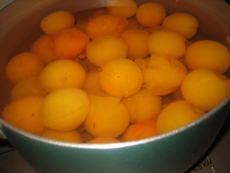 ・実が入った鍋に果肉入りの水を加え、火にかけ、ひと煮立ちさせます。
